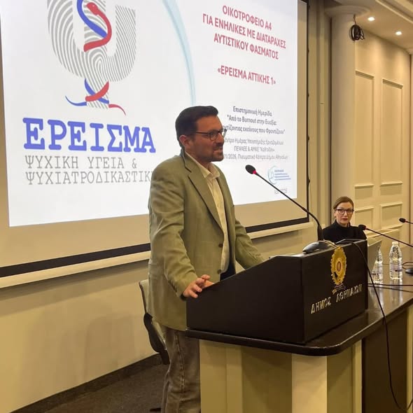 Στις 13 Ιανουαρίου 2026 ο Φορέας μας συμμετείχε με χαρά σε επιστημονική εκδήλωση στο Πνευματικό Κέντρο του Δήμου Αθηναίων, που διοργανώθηκε από την ΠΕΨΑΕΕ (Πανελλαδική Ένωση για την Ψυχοκοινωνική Αποκατάσταση και την Επαγγελματική Επανένταξη) και την ΚΑΘ’ ΟΔΟΝ ΑΜΚΕ, αλλά και με την υποστήριξη του Εργαστηρίου Κοινωνικής και Οργανωσιακής Ψυχολογίας του ΕΚΠΑ. Το Οικοτροφείο μας “Έρεισμα Αττικής 1” εκπροσώπησε ο κοινωνικός λειτουργός, Νίκος Φωκιανός, προβάλλοντας το έργο μας, τις παρεχόμενες υπηρεσίες και τις πρακτικές που υλοποιούνται για ενήλικες με αυτισμό μέτριας λειτουργικότητας. Το μείζον ζήτημα που αναδείχθηκε ήταν η πρόληψη του Συνδρόμου Επαγγελματικής Εξουθένωσης (Burn out) και η σπουδαιότητα της πρόληψης του αλλά και της φροντίδας των ίδιων των εργαζομένων εντός των δομών εργασίας.